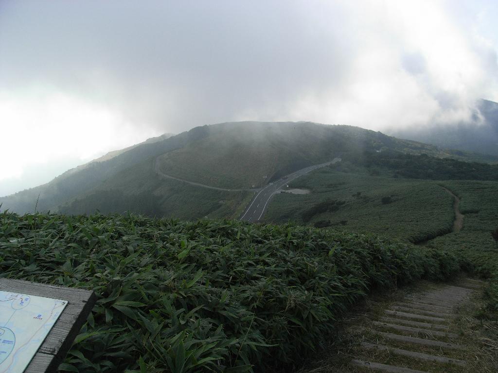 低い笹藪の中の遊歩道をたどって県道まで降りれた。