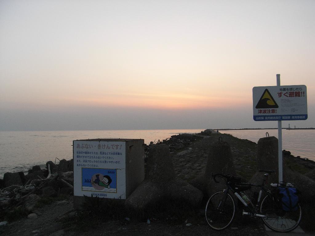 今日はあまり急がない。 県道を縫って戸沢まで出たら、ライン下りを横目に川沿いを西進。 庄内に出る手前で高台の温泉に入ったり、眺望のよい公園に登ったり。 展望台から平野部をのたくって日本海に注ぎ出る最上川の景色を眺めた。 北を見ると出羽富士とも呼ばれる鳥海山。まだ白い冠をかぶってる。 う~ん。かっくいい山だ。翌日途中まで登ってみようかな? 陽が落ちる前に再び最上川の脇に降りて河川敷を走り、河口まで到達した。 そういえば、自転車で日本海まで来たのは始めてだなぁ。夕日を映す日本海を前に、苦楽を共にした相棒に語りかけてみる。 「どーだい?初めて見る日本海はァ。」 アルミでできたパートナーは何も言わず、堤防に腰をつけ、海を見ていた。 酒田市街のビジネスホテルにチェックイン。 翌日は秋田のYHがいっぱいだったので、能代のビジホを予約した。 [ INDEX ] [ 初日 ] [ 2日目 ] [ 3日目 ] [ 4日目 ] [ 5日目 ] [ 6日目 ] [ 7日目 ] [ 8日目 ] [ 最終日 ] |