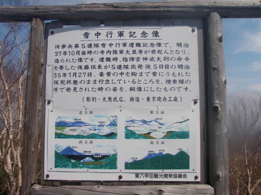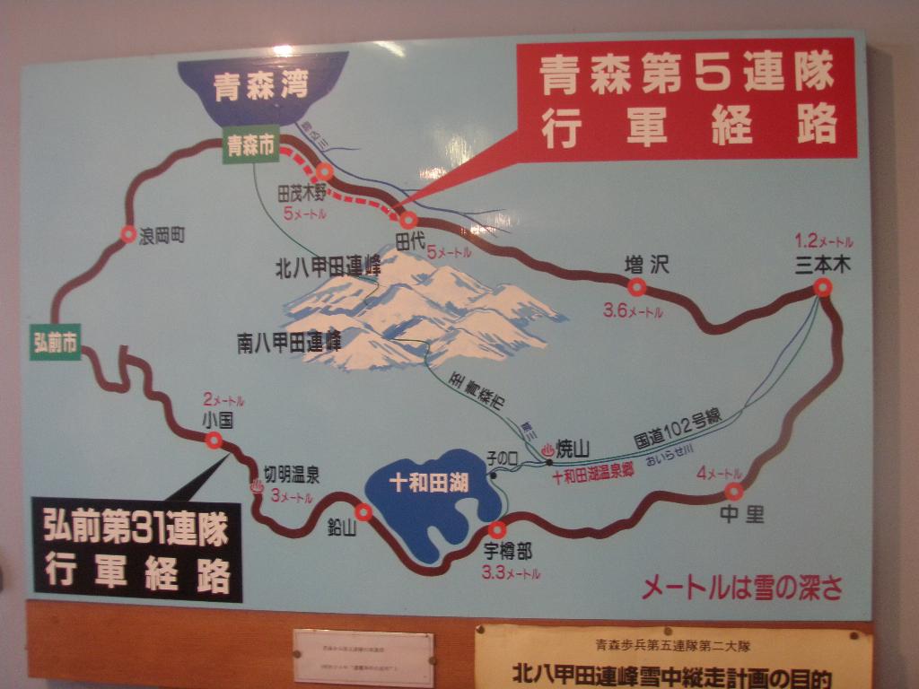 | コメント | 八甲田山地縦走中に遭難した青森第5連隊の経路と、同時期に逆向きを走破した弘前第31連隊の経路。現在の国道からは少し離れている。 | |||